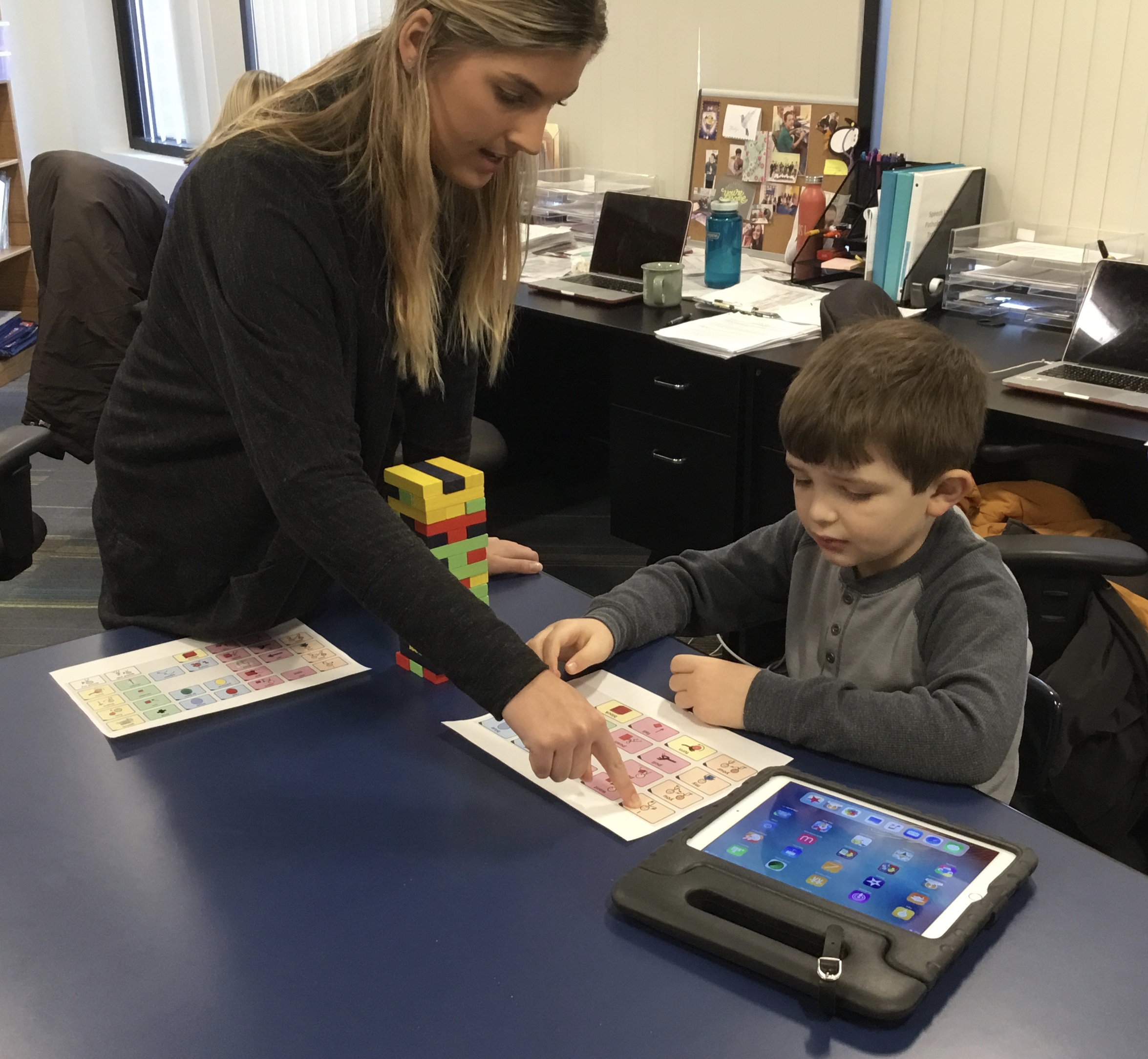 “Ben and I played Jenga a couple of times over the weekend after the speech team put the program on his iPad,” Ben’s mother shared. “I prompted him to push the buttons on the iPad and he would repeat the words on his own. We mostly worked on ‘my turn’ and ‘your turn’ because he usually says ‘Ben’s turn’ and ‘Mommy’s turn’. By the end of the second game, he said, “Mommy it’s your turn,” all on his own!”